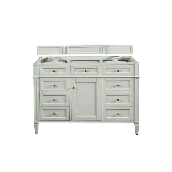 The Brittany 48in Sage Green Single Vanity by James Martin Vanities features classic details that bridge both traditional and transitional styles. This beautiful piece of furniture includes one hide-away top row tip-out drawer, plus six full-depth drawers, two of which are double-height for storage of taller items.This cabinet also has one door, which conceals an interior shelf, for ample storage. Hand crafted in yellow poplar solids and yellow poplar veneers with Satin Nickel hardware. Matching wood backsplash is included.