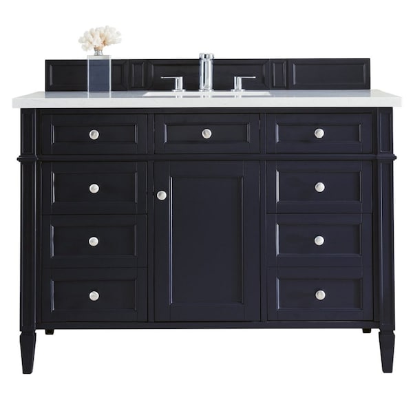 The Brittany 48in Victory Blue Single Vanity by James Martin Vanities features classic details that bridge both traditional and transitional styles. This beautiful piece of furniture includes one hide-away top row tip-out drawer, plus six full-depth drawers, two of which are double-height for storage of taller items. This cabinet also has one door, which conceals an interior shelf for ample storage. Hand crafted in yellow poplar solids and yellow poplar veneers with Satin Nickel hardware.Matching wood backsplash is included. The look is completed with a 3 CM eased edge 3 CM eased edge Arctic Fall Solid Surface top with one white ceramic rectangular sink.