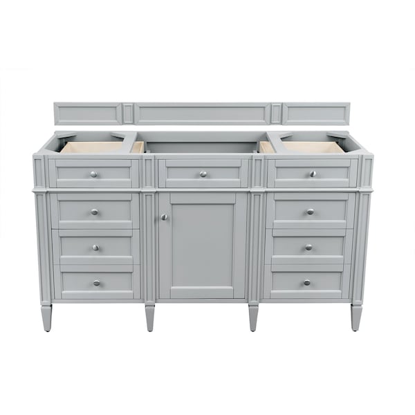 The Brittany 60in Urban Gray Single Vanity by James Martin Vanities features classic details that bridge both traditional and transitional styles. This beautiful piece of furniture includes one hide-away top row tip-out drawer, plus six full-depth drawers, two of which are double-height for storage of taller items.This cabinet also has one door, which conceals an interior shelf, for ample storage. Hand crafted in yellow poplar solids and yellow poplar veneers with Satin Nickel hardware. Matching wood backsplash is included.