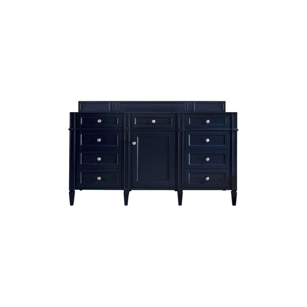 The Brittany 60in Victory Blue Single Vanity by James Martin Vanities features classic details that bridge both traditional and transitional styles. This beautiful piece of furniture includes one hide-away top row tip-out drawer, plus six full-depth drawers, two of which are double-height for storage of taller items.This cabinet also has one door, which conceals an interior shelf, for ample storage. Hand crafted in yellow poplar solids and yellow poplar veneers with Satin Nickel hardware. Matching wood backsplash is included.