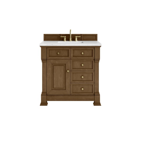 The Brookfield 36 in. Single Vanity in Honey Oak by James Martin Vanities offers a blend of traditional elegance and contemporary sophistication. The raised panel picture frame doors and detailed corner molding reflect timeless craftsmanship, while the warm Honey Oak finish and Champagne Brass hardware lend a fresh, modern appeal. This beautifully crafted vanity features a single-door cabinet with an interior shelf, a double-height drawer for added versatility, and two standard drawers for ample storage. The warm wood tones highlight the natural Oak wood grains, lending sophistication and charm to your space. The addition of an Arctic Fall Solid Surface top with white porcelain undermount sink completes the look.