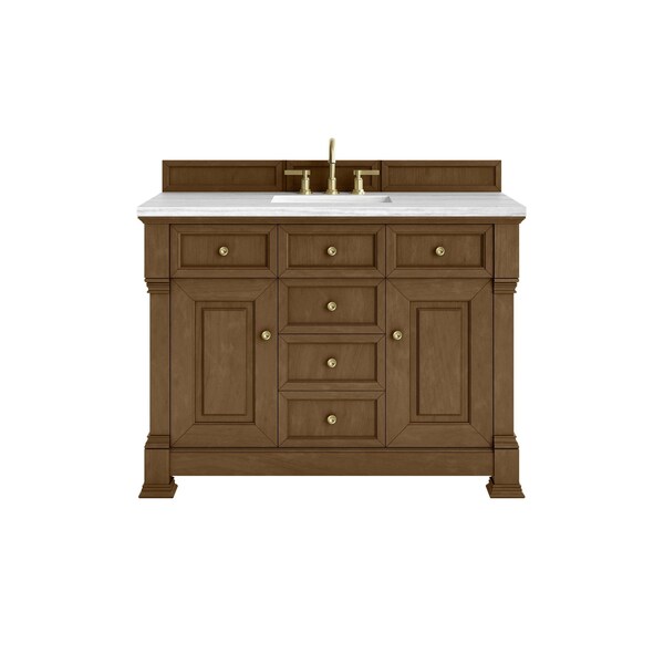 The Brookfield 48 in. Single Vanity in Honey Oak by James Martin Vanities offers a blend of traditional elegance and contemporary sophistication. The raised panel picture frame doors and detailed corner molding reflect timeless craftsmanship, while the warm Honey Oak vanity finish and Champagne Brass hardware lend a fresh, modern appeal. This beautifully crafted piece features two single-door cabinets that open to interior shelves, three standard drawers and one double height drawer for ample storage. The warm wood tones highlight the natural Oak wood grains, lending sophistication and charm to your space. The addition of an Arctic Fall Solid Surface top with white porcelain undermount sink completes the look.