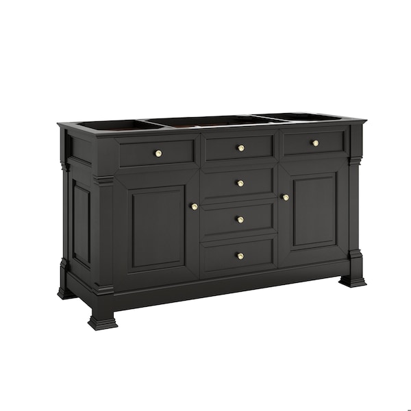 The Brookfield 60 in. Single Vanity in Black Onyx, by James Martin Vanities, offers a blend of traditional elegance and contemporary sophistication. The raised panel picture frame doors and detailed corner molding reflect timeless craftsmanship, while the rich Black Onyx finish and Champagne Brass hardware lend a fresh, modern appeal. This beautifully crafted vanity features a two single door cabinet that open to interior shelves, along with five standard drawers for ample storage. The timeless Black Onyx finish lends sophistication and charm to your space. Select one of our countertops to complete your vanity.