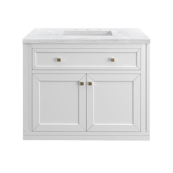 The sophisticated details and clean lines of the Chicago 36 in. Single Vanity by James Martin Vanities make it the perfect choice for any bathroom. Featuring a Glossy White finish, this vanity offers ample storage with its two-door cabinet, adjustable interior shelf, and top-row tip-out drawer. Champagne Brass knobs and legs add a contemporary touch; or choose to forego the metal legs for a modern wall-mounted installation. The addition of a modern Arctic Fall Solid Surface top with undermount sink completes the look.