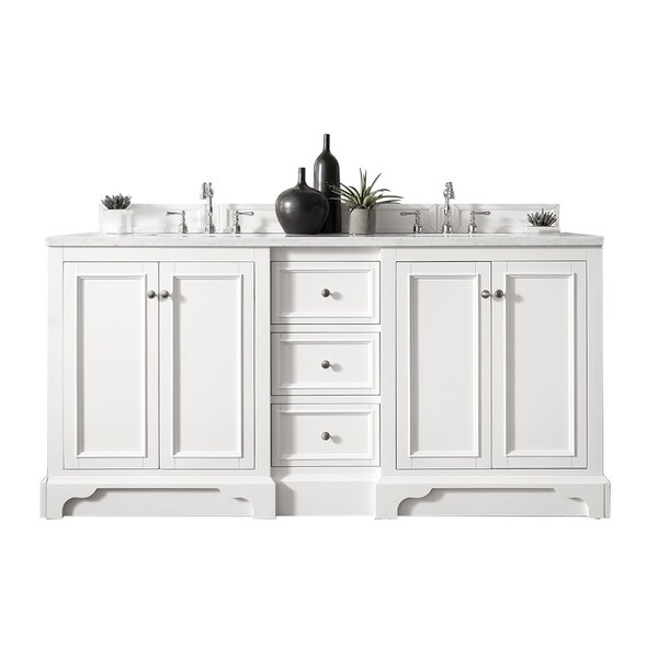 The De Soto 72in Bright White Double Vanity was designed to fulfill a wide range of tasks. Storage and convenience are foremost in this collection. The De Soto series provides ample storage in each of the six available widths and configurations. Cabinets are crafted from North American yellow poplar hardwoods and veneers. Low maintenance is provided with the full plinth base located behind the rounded bracket feet. Premium features in this series include an electrical and USB outlet and beautiful faux-shagreen drawer organizers. Optional wood backsplash included. The look is completed with a 3 CM eased edge Arctic Fall Solid Surface top with one white ceramic rectangular sink.