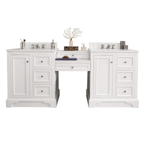 The De Soto 82in Bright White Double Vanity Set by James Martin Vanities features two 30in cabinets connected by a matching 22in make-up counter. The cabinet includes one faux shagreen drawer organizer and interior shelf space. This cabinet also includes a decorative wood backsplash. The look is completed with a 3 CM eased edge Arctic Fall Solid Surface top and two white ceramic rectangular sinks.