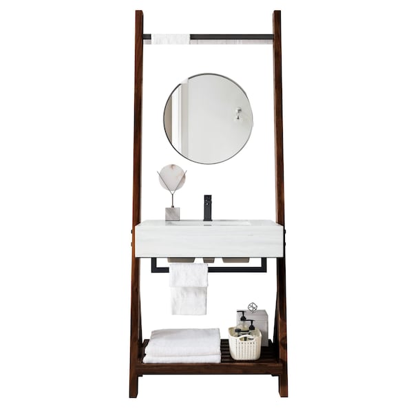 The Lakeside 30in Mid-Century Walnut finish vanity is a unique, two-sided frame vanity. This vanity is constructed using yellow poplar solids and poplar veneers, with a stainless steel towel bar in a Matte Black finish, as well as a solid wood slatted shelf for additional storage. The look of this vanity is completed with an Arctic Fall Solid Surface top with a wide apron, rectangular sink.