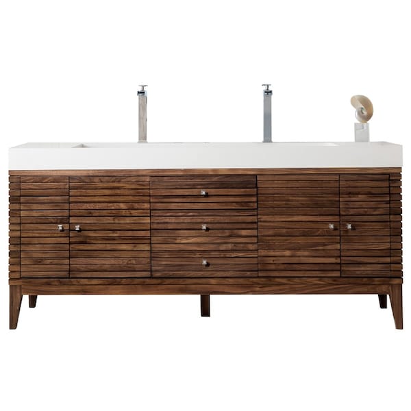 Linear 72in Double Vanity, Mid-Century Walnut w/ Glossy White Composite Stone Top