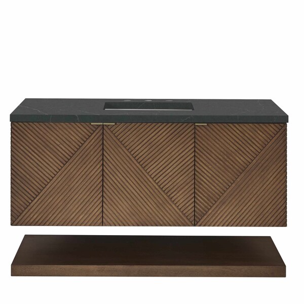 The 48 in. Marcello wall-mounted vanity adds a touch of mid-century modern charm to your bathroom, while the warm Chestnut finish provides timeless elegance. The reeded, patterned detail on the door fronts continues around the sides in geometric perfection. Crafted from solid Acacia, with rich, resawn Acacia veneer over Marine MDF, accented by sleek, tab-style door pulls in Champagne Brass. The wide, spacious interior drawers are framed on the top by a generous shelf and features our signature aluminum laminate liners and full extension, soft-close undermount glides. Perfectly completing the look is a spectacular top characterized by depth and a sense of movement with a suede finish, The Charcoal Soapstone Silestone top is a timeless statement to complete the look of your vanity. The wall-hanging feature contemporizes the look with an easy-to install bracket system included.