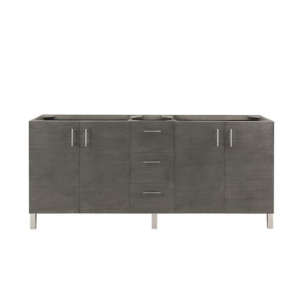 The Metropolitan 72in Silver Oak Double Vanity Cabinet by James Martin Vanities is a wall-mount optional cabinet with mounting brackets and removable Brushed Nickel legs. This cabinet offers ample storage space and soft-close doors and drawers.