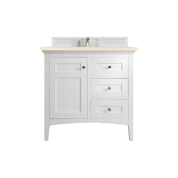 The Palisades 36in Bright White Single Vanity features one door with interior shelf space, two drawers, and tapered legs. Premium features include an electrical and USB outlet located on a custom designed shelf behind the door and a bamboo drawer organizer. Shaker made modern, Palisades was designed to lend a modern flair to traditional Shaker-style cabinets.