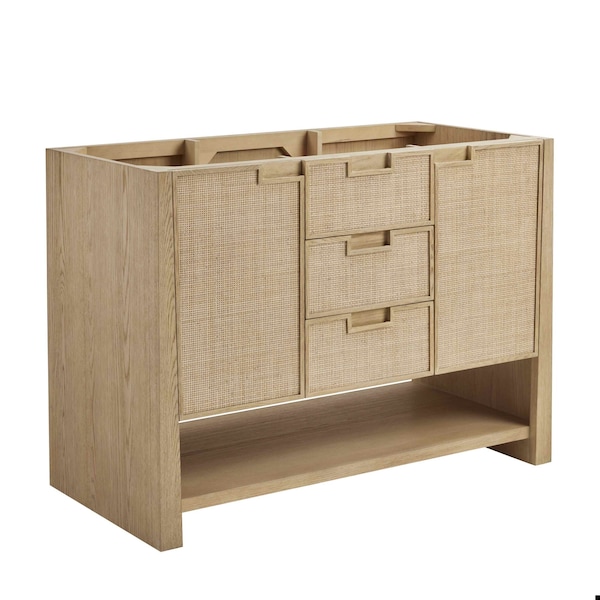 The Solene 48 in. Single Vanity elegantly weaves together a beautiful blend of natural materials. Framed in solid White Oak, the natural Cane detail and warm Seaside Oak finish make the Solene a stunning centerpiece for your bathroom. The subtle reverse-tapered legs and modern cutout cabinet pulls add visual intrigue to your space. Featuring an integrated USB/120V power unit and removable White Oak drawer organizer, this vanity offers ample storage with its two full-extension drawers, one tip-out drawer, and two single cabinets with interior shelving and two internal drawers, in addition to an open lower shelf. Complete the look with one of our 3 cm tops and bring your bathroom to life with the natural elements and contemporary aesthetic of Solene.