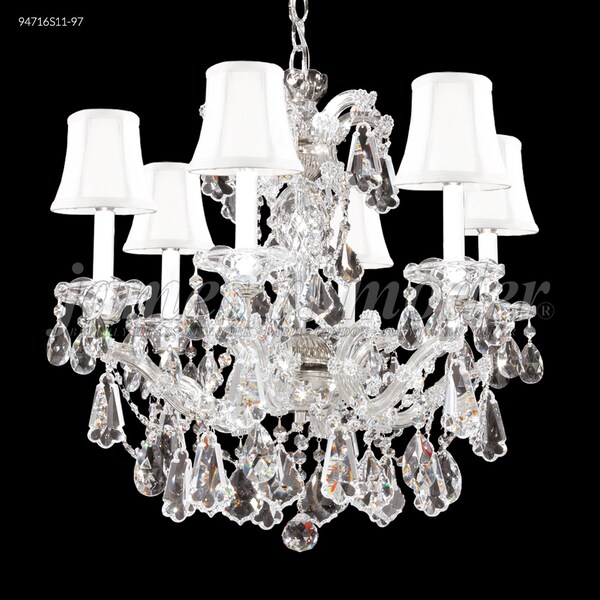 A fabulous variety of beautiful Crystal shapes adorn these classic fashionable Chandeliers accented with superb flared Crystal pendalogues. Traditional European styling with a Royal touch will add sophistication to any setting.