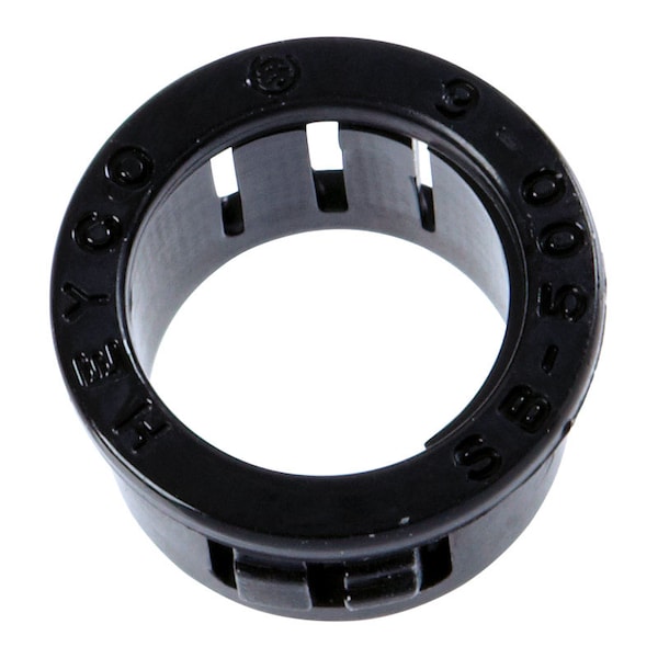 The nylon snap bushing is used in rough, unfinished holes, converting them into smooth openings to mechanically protect and insulate electrical and telecommunications cables, tubing, rope and utility lines. With multiple locking steps to easily snap into place in a mounting hole that has a panel thickness up to 0.125 inches and a mounting hole diameter of 0.5 inches.