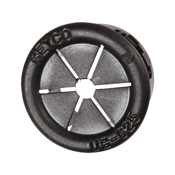 The universal all fit bushing has a flexible opening that adjusts to support and accept various diameters and shapes of cables, while absorbing shock and vibration. The nylon bushing cushions and insulates cables, tubing, hoses or shafts. With multiple locking steps to easily snap into place in a mounting hole that has a panel thickness up to 0.125 inches and a mounting hole diameter of 0.625 inches.
