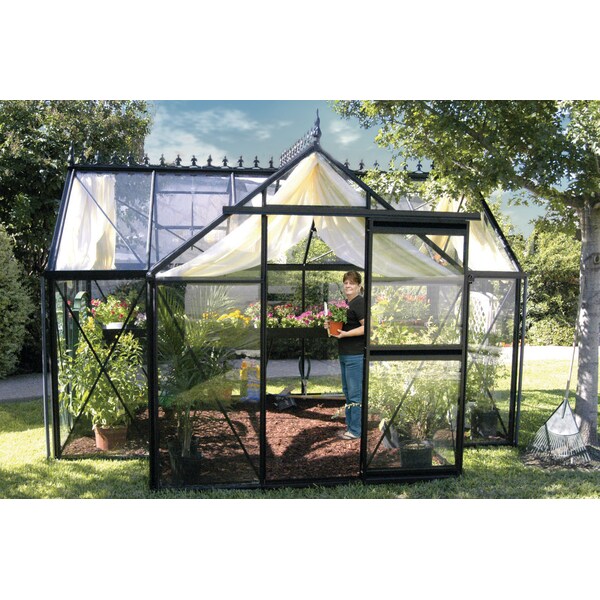 Junior Orangerie Greenhouse - T-shaped floorplan: 10'3" D x 13' L x 8'2" H, 5'2" side walls, 4 mm tempered glass, 2 roof windows with auto openers, 1 sliding door, large bottom frame, gutters with downspouts.