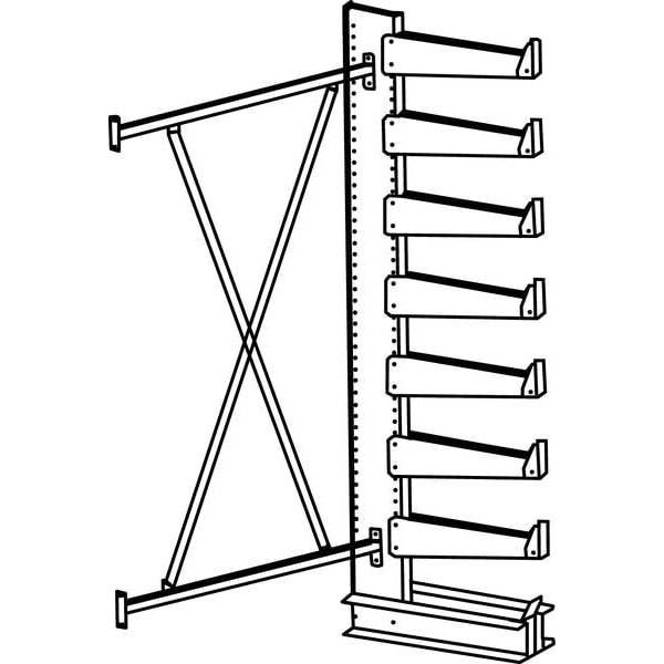 Cantilever Rack, Overall Depth 21 1/4 in, Overall Height 84 in, Overall Width 74 3/4 in, Load Capacity per Level 500 lb, Whole Unit Load Capacity 3,500 lb, Arm Gauge 14 ga, Arm Length 14 in, Arm Lip Height 1 1/2 in, Removable, Straight, Number of Arms 7, Number of Usable Sides 1, Rack Configuration Add-On, Rack Depth 21 1/4 in, Base Length 21 in, Center Brace Length 72 in, Column Gauge 11 ga, Medium-Duty, Enamel, Arms Adjustable on 1-1/2 in Centers, Steel