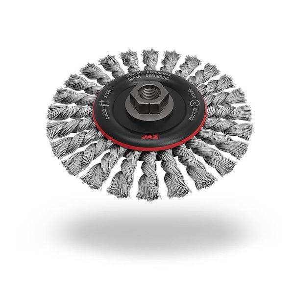 Jaz USA Twist Knot Wire Wheel Brush, Size: 6", Type: Regular twist knot wire wheel in individual package, Style: 24 Knots, Wire Size: .020", Material: Steel, Smooth Arbor Hole: 1/2"-5/8", Packaging Qty: 1 per each