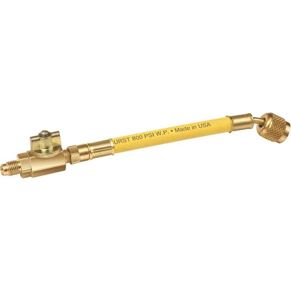 Single 6 in. yellow Kobra high pressure hose CLV-6 series. Whip end with ball valve that opens to full flow. Traps refrigerant discharge in hose.1/4 in. x 6 in. ball valveWhip endPSI 800/4000 burstTraps refrigerant