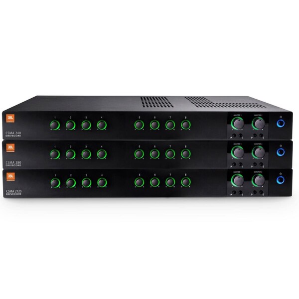 The JBL CSMA series of Mixer-Amplifiers are a professional tool with a sleek industrial look that is designed and built for commercial sound applications. Utilizing Crown's DriveCore technology enables significantly reduced size and weight - all mixer/amps are highly efficient, fanless and just 1U rack space high. There are both single channel and two channel models with four or eight mixer channels, respectively.