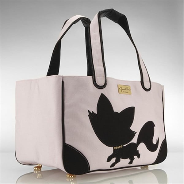 Features.100% cotton canvas shell..Strap.24 in.long 1 1/2 in.wide 10 in.drop..Leash clip built into both linings should you choose to carry a small pet inside..Leash clip size.1 3/4 in.Strap Length.8 1/2 in.Strap width.3/4 in..Includes 1 micro mink not animal fur snap out lining 1/2 in.diameter gold snaps and one flat cotton signature lining.Utility patented.Dry clean/spot clean recommended..One removable signature lined support board to place at bottom of bag underneath lining..4 gold paw purse feet Design patented.Feet are removable for dry cleaning..Padded dual shoulder straps.Satin stitched pet applique..Jeweled pet collar on the feline applique..Hanging pocket on interior back wall measures 6 1/2 in.high x 9 1/2 in.wide..Key ring/binky holder attached by snap..Featuring detailed contrast stitching..Black canvas wrapped piping accent the edges of the tote..Carries 1 2 or 3 pets up to 16 lbs..Color.White Foxy Pom.Dimension.10 H x 16 W x 9 D in..Item Weight.2 lbs.
