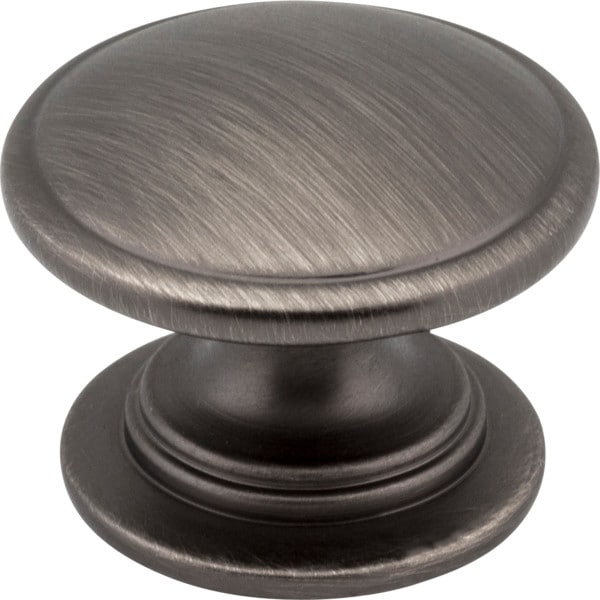 Durham's ringed 1-1/4" diameter Brushed Pewter cabinet knob features an appealing yet simple shape that is sure to add traditional charm to your space. This Jeffrey Alexander knob is paired with an appealing barreled pull with similar ring detail available in four standard pull lengths and a 12" appliance handle. Offered in seven other finishes, this collection is designed to harmonize with various cabinet styles and finishes. Each item is individually wrapped to protect the item from damage. Attachment hardware is included.