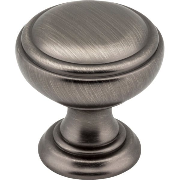 Tiffany combines a classically elegant shape with a transitional twist for a look that is timeless. This graceful 1-1/4" diameter Brushed Pewter cabinet knob features step details accompanied by flowing curves for a comfortable feel in your hand. Combining this knob with five standard pull lengths and an appliance handle option makes this Jeffrey Alexander pull design a popular choice. Adding to the desirability, this knob is offered in seven stunning finishes, including both of our trending gold tones. Each item is individually wrapped to protect the item from damage. Attachment hardware is included.