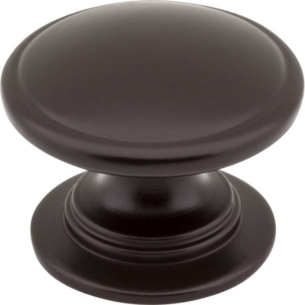 Durham's ringed 1-1/4" diameter Dark Bronze cabinet knob features an appealing yet simple shape that is sure to add traditional charm to your space. This Jeffrey Alexander knob is paired with an appealing barreled pull with similar ring detail available in four standard pull lengths and a 12" appliance handle. Offered in seven other finishes, this collection is designed to harmonize with various cabinet styles and finishes. Each item is individually wrapped to protect the item from damage. Attachment hardware is included.