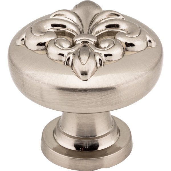 Let your decorative side shine through with the French elegance of Lafayette by Jeffrey Alexander. This noteworthy 1-3/8" diameter Satin Nickel cabinet knobs offers a very prominent fleur-de-lis design on its simple shape. Three standard pull lengths and an appliance handle are the perfect complement to this brilliantly styled knob, available in four captivating finishes. Each item is individually wrapped to protect the item from damage. Attachment hardware is included.