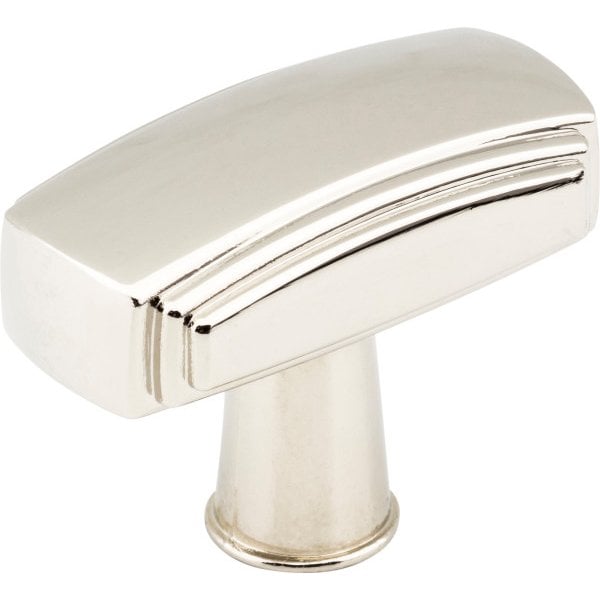 Delgado is a contemporary, steadfast design that creates a clean look while also having a great feel in the hand. This 1-9/16" overall length Polished Nickel Jeffrey Alexander cabinet knob has stretching soft lines with a unique linear stepped detail, adding a little more personality. This handsome design is available in three standard pull lengths as well as a 12" and 18" appliance handle. The details of this modern collection shine through in five beautiful finishes. Each item is individually wrapped to protect the item from damage. Attachment hardware is included.