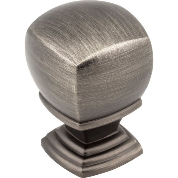 Katharine by Jeffrey Alexander brings a bit of dramatic glamour to any home. Harkening days of Old Hollywood, this alluring and curvaceous rounded square knob sits atop of stacked square feet. This 1" overall length Brushed Pewter Jeffrey Alexander cabinet knob is also available in a petite 7/8" option to find the perfect fit with any design. Three coordinating standard pull lengths, featuring a higher hand clearance which is a great option for Aging in Place, are available to pair with this unique knob. Choose from four classic finishes to complete any traditional or transitional space. Each item is individually wrapped to protect the item from damage. Attachment hardware is included.