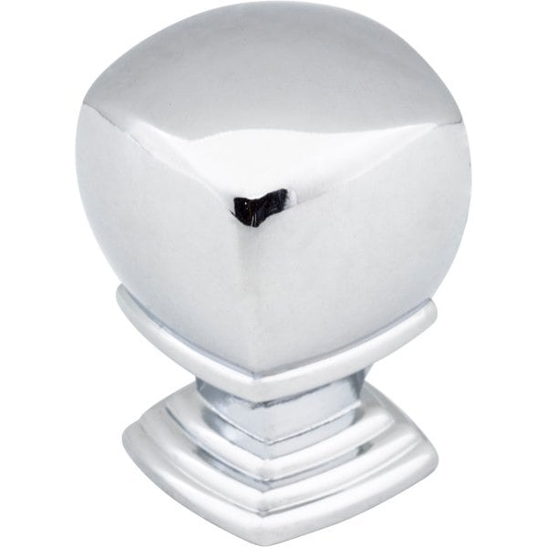 Katharine by Jeffrey Alexander brings a bit of dramatic glamour to any home. Harkening days of Old Hollywood, this alluring and curvaceous rounded square knob sits atop of stacked square feet. This 1" overall length Polished Chrome Jeffrey Alexander cabinet knob is also available in a petite 7/8" option to find the perfect fit with any design. Three coordinating standard pull lengths, featuring a higher hand clearance which is a great option for Aging in Place, are available to pair with this unique knob. Choose from four classic finishes to complete any traditional or transitional space. Each item is individually wrapped to protect the item from damage. Attachment hardware is included.