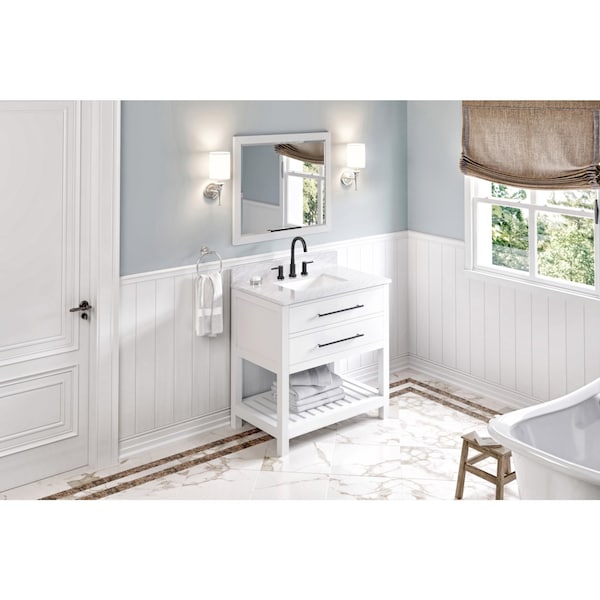 Clean lines and perfectly mitered corners create this classically simple mirror. This White 33 wide mirror with beveled glass is the perfect size for 36 and 48 vanities. Coordinates well with Shaker style and modern collections. Overall measurements: 33 W x 1 D x 28 H. Made of furniture-grade hardwood.