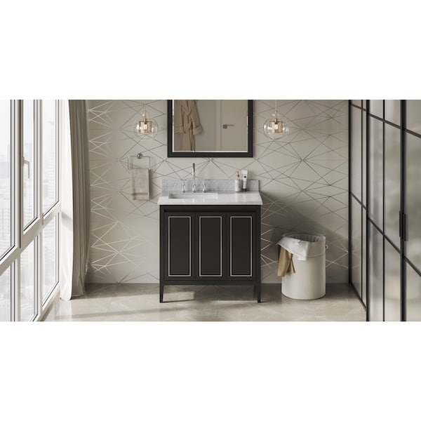 36In. Black Percival Vanity, Left Offset, White Carrara Marble Vanity Top, Undrmnt Rctngl Bowl