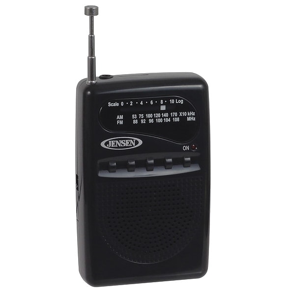 Radio, Features AM/FM Receiver, Rechargeable Battery, Rotary Telescopic Antenna, Bluetooth Compatible No, Disk Formats Not Applicable, Number of Speakers 1, Display Screen Type Not Applicable, Display Type Analog, Power Source Battery, Attachment Type Clip, Auxillary Input Yes, Auxillary Output No, Battery Backup No, Battery Size AAA, Color Black, Includes Batteries No, Number of Batteries Required 2, Overall Depth 3/4 in, Overall Height 3 1/4 in, Overall Width 2 1/8 in, Weight 0.13 lb