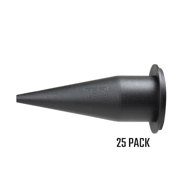 High quality replacement cone nozzles for JES Innovations sausage and bulk caulk guns. Durable construction ensures consistent performance. Easily enlarge the cone opening cutting the tip to size. The cone nozzles are designed to be single use only. Also fits other standard sausage and bulk caulk guns. The base measures 2-1/4 in. in outer diameter and 1-1/3 in. in inner diameter. Pack of 25.