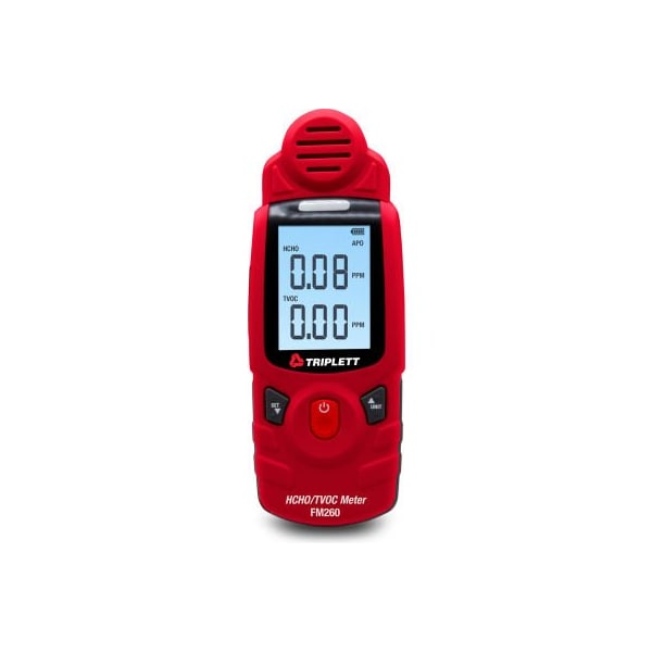 The triplett model fm260 formaldehyde and tvoc meter can simultaneously display real-time measurements of hcho/ch2o formaldehyde and tvoc total volatile organic compounds concentrations in the air. Potential sources for tvocs include paints, finishes, adhesives, cigarette smoke, pesticides, personal care products, car exhaust, new furnishings, wall coverings, household cleansers, and cooking fuels. Chemicals include: acetone, ethylene glycol, formaldehyde, xylene, 1,3butadiene, tetrachloroethene, hydrogen sulfide, ammonia, toluene, benzene, methylene chloride, perchloroethylene, and mtbe. The meter features fuel cell formaldehyde sensor technology for high accuracy measurement, a backlit dual lcd, two selectable units of measure ppm, mg/m, audible and visual high/low alarms for hcho. Auto power off conserves battery life. Includes rechargeable 7.4v li-po battery and ac charger/adapter. 1-year warranty.