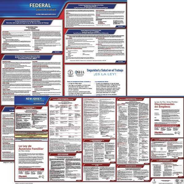 Labor Law Poster Set, Compliance Type Federal and State Labor Law, FMLA Notice Included Yes, Height 27 in, Includes (1) State Poster, (1) Federal Poster, Language Spanish, Material Plastic, Number of Posters Included 3, Product Type Poster Set, Subject Matter Federal and State Labor Law, Subscription Length Not Applicable, Width 43 in, State/Province NJ, Municipality Not Applicable, Workers Compensation Notice Included Not Applicable