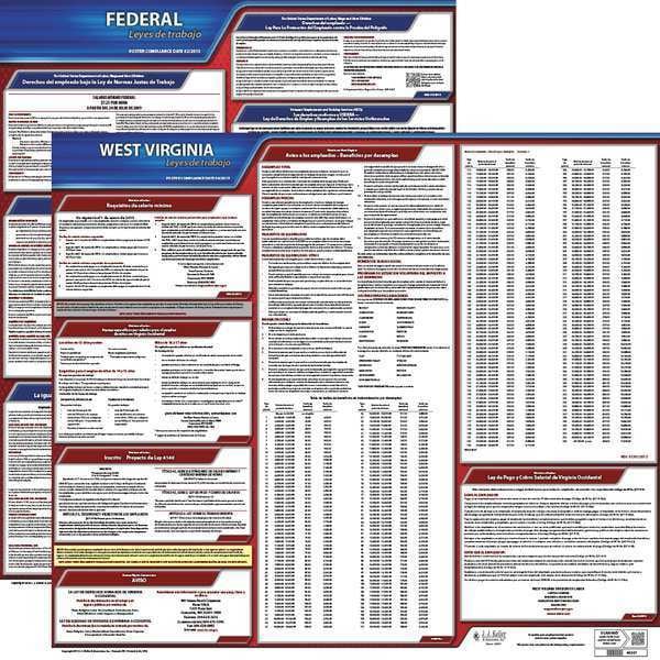 Labor Law Poster Set, Compliance Type Federal and State Labor Law, FMLA Notice Included Yes, Height 27 in, Includes (1) Federal Poster, (1) State Poster, Language Spanish, Material Plastic, Number of Posters Included 2, Product Type Poster Set, Subject Matter Federal and State Labor Law, Subscription Length Not Applicable, Width 19 in, State/Province WV, Municipality Not Applicable, Workers Compensation Notice Included Not Applicable