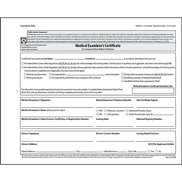 Medical Examination Certificate, Format Snap-Out, Includes Carbon Carbonless, Language English, Ply Count 2-Ply, Form Type Medical Examination Certificate, Features Not Applicable, Standards 49 CFR Section 391.43, DOT Compliance, Material Paper