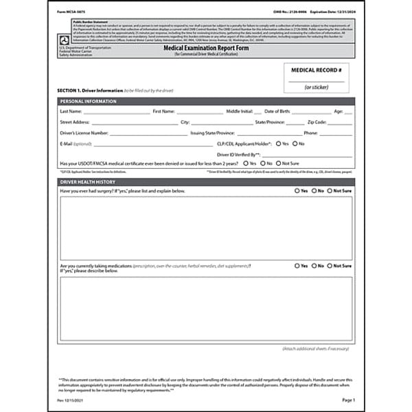 Medical Examination Report, Format Loose Leaf, Includes Carbon Carbonless, Language English, Ply Count 1-Ply, Form Type Medical Examination Report Form, Features Not Applicable, Standards 49 CFR Section 391.43, DOT Compliance, Material Paper