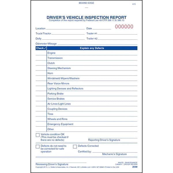 Driver Vehicle Inspection Form, Format Book, Includes Carbon Carbonless, Language English, Ply Count 2-Ply, Form Type Driver Vehicle Inspection Report, Features Lists 15 Vehicle Inspection Areas and Has Space to Record any Defects, Standards DOT Compliance