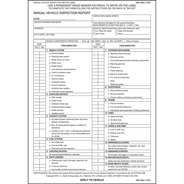 Vehicle Inspection Report/Label, Format Snap-Out, Includes Carbon Carbon, Language English, Ply Count 3-Ply, Form Type Annual Vehicle Inspection Report, Features For Vehicles Without Dry Storage Document Compartments, Standards 49 CFR Section 396.21, Package Quantity 10