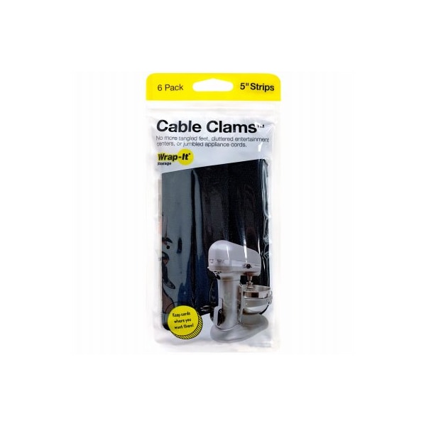 Cable Clams 5 Strip Black These hook and loop Cable Clams will help you manage your cords and keep them in place right where you want them APPLIANCE CORD ORGANIZER Keep your appliances neat and organized No more wrapping the cord around the appliance hoping it will stay in place These Cable Clams can attach right to the appliance allowing these to be the perfect appliance cord keeper ORGANIZE YOUR DESK No more fumbling for the cord that slipped off your desk or getting your feet in a tangled mess of cords the WrapIt Storage Cable Clams are perfect for keeping those cords and cables in place and out of your way Keep computer cords, usb cords, pc cords, speaker wires and more under control a great solution to under desk cable management and organization Easy to Use and Great for All Surfaces Simply peel and stick to apply to any just about any surface