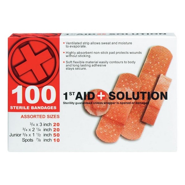 Features -Sub Brand: 1st Aid + Solution -Theme: Health and Beauty -Product Type: Aid Plus Bandages -Number in Package: 100 Pack -Height: 16.93 in. -Color Family: Assorted -Length: 12 in. -Width: 12.99 in.