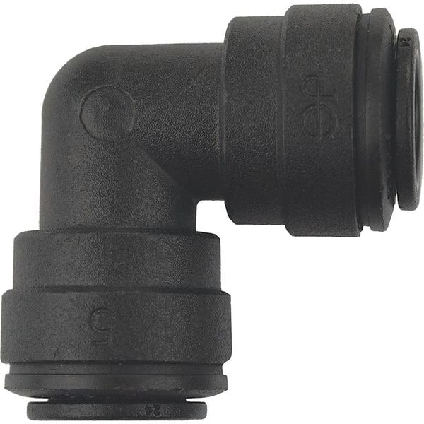 Push-Fit Elbow Fitting, Application Food Process, Fitting Side A Connection Type Push-to-Connect, Fitting Side B Connection Type Push-to-Connect, Fitting Side A Tube Outer Diameter 3/8 in, Fitting Side B Tube Outer Diameter 3/8 in, Fitting Material Polypropylene, Color Black, Includes Pre-Applied Thread Sealant Pre-Applied Thread Sealant Not Included, Maximum Operating Pressure 150 psi, Maximum Operating Temperature 150 Degrees F, Specific Fitting Shape 90 Degrees Elbow