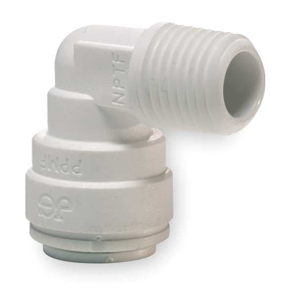 Push-Fit Elbow Fitting, Application Food Process, Fitting Side A Connection Type Push-to-Connect, Fitting Side B Connection Type NPTF, Fitting Side B Pipe Size 1/4 in, Fitting Side A Tube Outer Diameter 3/8 in, Fitting Material Polypropylene, Fitting Thread Size 1/4 In.-18, Color White, Includes Pre-Applied Thread Sealant Pre-Applied Thread Sealant Not Included, Maximum Operating Pressure 150 psi, Maximum Operating Temperature 150 Degrees F, Specific Fitting Shape 90 Degrees Elbow