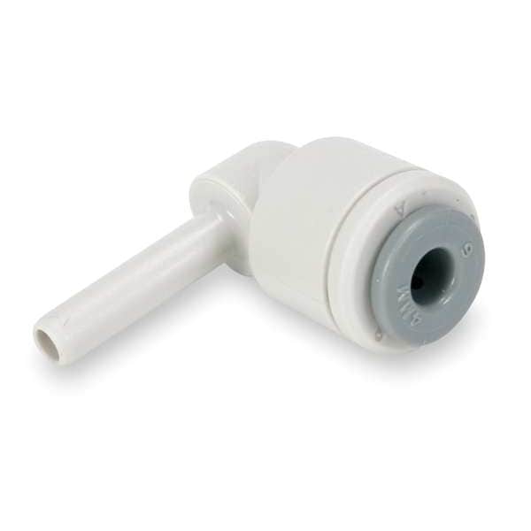 Push-Fit Elbow Fitting, Application Food Process, Fitting Side A Connection Type Push-to-Connect, Fitting Side B Connection Type Tube Stem, Fitting Side A Tube Outer Diameter 1/4 in, Fitting Side B Tube Outer Diameter 1/4 in, Fitting Material Acetal, Color Gray, Includes Pre-Applied Thread Sealant Pre-Applied Thread Sealant Not Included, Maximum Operating Pressure 150 psi, Maximum Operating Temperature 150 Degrees F, Specific Fitting Shape 90 Degrees Elbow Adapter