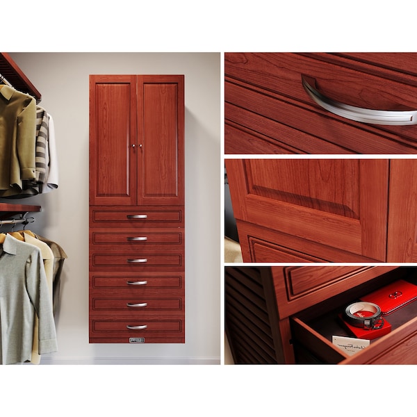 This 100% Solid Wood Accessory Tower brings you a full cabinet-style design that offers multiple storage options all in one place. It features five modern-style drawers in a combination of 6in. and 8in. depths for a comprehensive solution to meet your needs. Solid Wood Panel doors to cover the adjustable shelves and create a custom look that best suits your personal taste.What's in the Box?-This item ships in multiple packages-Two 6ft. Tower Sides-One 2ft. Bottom Shelf-One 26.25in. Top Shelf-Two 2ft. Adjustable Shelves -Two 6in. Drawers Modern Style-Three 8in. Drawers Modern Style-Two Solid Wood Panel Doors-Six Tower Brackets-Two Shelf Mounting L-Clips-All Required Hardware & Fasteners-Assembly Instructions-One Year Manufacturers Limited WarrantyProduct Details-100% Solid Wood-12in. depth-6ft. Height-26.25in. Wide -Integrate into your existing design-Compatible with all Tower Accessories-Adjustable shelving for customized needs-Two 6in. Drawers Modern Style-Three 8in. Drawers Modern Style-Full extension, slow-close drawer glides-Two Solid wood Panel Doors-Concealed slow-close pocket hinges-Ventilated sides and shelving for airflow-Use in Closet, Pantry, Linen, Bathroom, LaundrySpecification-Tower:-Depth: 12in. -Exterior Height: 72.75in.-Interior Height: 69.25in.-Exterior Width: 26.25in.-Interior Width: 24in.-Product Weight: 35lbs. -Supported Weight: 25lbs. per lineal foot-Included Shelves:-Shelf Depth: 12in. -Shelf Width: 24in.-Total Shelf Weight: 14lbs. -Included Drawers:-Drawer Face Height: 6in. & 8in.-Drawer Face Width: 26.25in.-Drawer Box Depth: 11.25in. -Drawer Box Width: 21.75in. 15.25in.-Drawer Box Height: 5in. & 7in.-Drawer Handle Hole Span: 5in.-Total Drawer Weight: 48lbs. -Included Doors:-Door Depth: .75in.-Door Width: 12.75in. Each-Door Height: 35in.-Weight: 15lbs.Wood