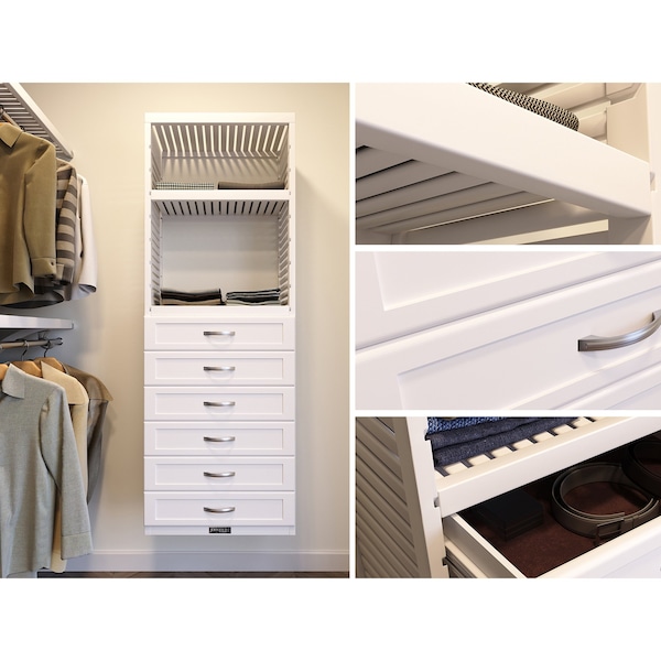 When large spaces call for even more storage, this 6ft Tower offers a great solution. Crafted of 100% Solid Wood, this handsome tower features five stylish Shaker Style Drawers giving you plenty of options to keep all your items neatly tucked away. The ventilated adjustable shelves allow open access to the things you need to keep right at hand.What's in the Box?-This item ships in multiple packages-Two 6ft. Tower Sides-One 2ft. Bottom Shelf-One 26.25in. Top Shelf-Two 2ft. Adjustable Shelves -Two 6in. Drawers Modern Style-Three 8in. Drawers Modern Style-Six Tower Brackets-Two Shelf Mounting L-Clips-All Required Hardware & Fasteners-Assembly Instructions-One Year Manufacturers Limited WarrantyProduct Details-100% Solid Wood-12in. depth -6ft. Height-26.25in. Wide -Integrate into your existing design-Compatible with all Tower Accessories-Adjustable shelving for customized needs-Two 6in. Drawers Modern Style-Three 8in. Drawers Modern Style-Full extension, slow-close drawer glides-Ventilated sides and shelving for airflow-Use in Closet, Pantry, Linen, Bathroom, LaundrySpecification-Tower:-Depth: 12in. -Exterior Height: 72.75in.-Interior Height: 69.25in.-Exterior Width: 26.25in.-Interior Width: 24in.-Product Weight: 45lbs. -Supported Weight: 25lbs. per lineal foot-Included Shelves:-Shelf Depth: 12in. -Shelf Width: 24in.-Total Shelf Weight: 14lbs. -Included Drawers:-Drawer Face Height: 6in. & 8in.-Drawer Face Width: 26.25in.-Drawer Box Depth: 11.25in. or 15.25in.-Drawer Box Width: 21.75in.-Drawer Box Height: 5in. & 7in.-Drawer Handle Hole Span: 5in.-Total Drawer Weight: 48lbs.